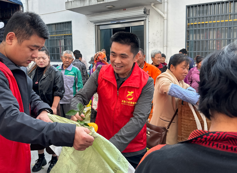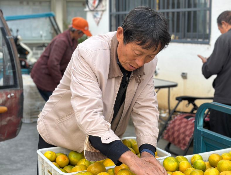 村委会门口,几张书桌临时拼成的简易工作台成为了忙碌的收购“中枢”。身着红马甲的乡、村干部和志愿者们分工明确,各司其职。“112号,余建新家!”随着工作人员的点名,一位桔农应声上前,沉甸甸的箩筐里装满了精心挑选的果实。电子秤上的数字闪烁跳跃,工作人员仔细核对后报数:“一百五十斤!”接着,金黄的柑桔被倾倒入塑料果框中。一旁等候的工作人员们立刻化身“搬运工”,将装满柑桔的果框稳妥地接力搬运到早已在一旁等候的大型厢式货车上。车厢内,一层层、一摞摞整齐码放的果框逐渐升高。桔农的交谈声、果箱的碰撞声、货车启动的微微轰鸣,交织成一首充满希望的丰收交响曲。