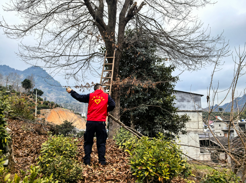 活动现场,志愿者们身着红马甲,带着梯子、手锯等专业工具,对树木的枯枝、病枝进行科学修剪。大家分工明确、配合默契,有的攀梯登高清理高处枯枝,有的俯身整理地面枝条,现场一派忙碌景象。结合山区乡村林木繁茂、冬春季枯枝易掉落的特点,志愿者重点修剪清理遮挡视线、影响通行、潜藏安全风险的枝条,从源头防范枯枝坠落伤人、损毁房屋等安全隐患。