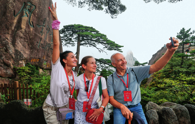 境外游客在黄山风景区的迎客松前自拍留念(2024年9月12日摄)新华社发(施亚磊摄)