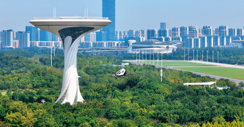 一架电动垂直起降飞行器(eVTOL)在合肥骆岗公 园演示飞行(2025 年 7 月 2 日摄) 周牧摄 / 本刊