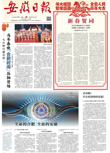 山河披锦绣,日月开新元。在这辞旧迎新、喜庆祥和的美好时刻,我们代表中共安徽省委、安徽省人民政府,向全省各族人民,向关心支持安徽发展的海内外朋友和社会各界人士,向节日期间坚守岗位的同志们,致以新春的问候和美好的祝福!给大家拜年了!