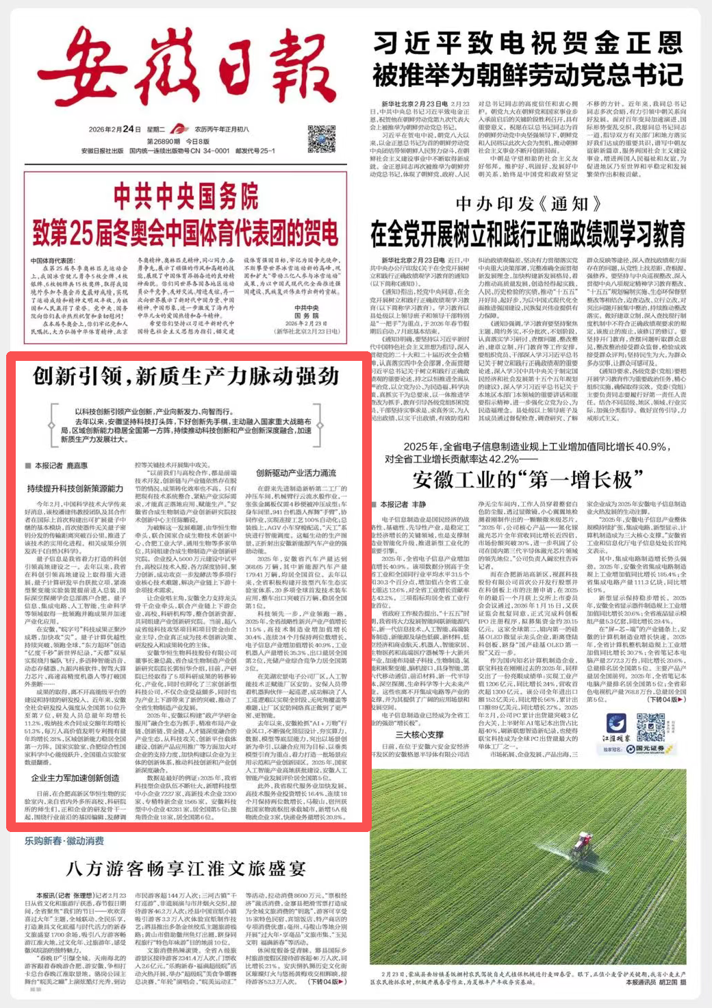 去年以来,安徽抢抓“AI+万物”行业风口,不断强化顶层设计,夯实算力、数据、模型等底层能力,突出以场景创新为牵引、以融合应用为目标、以垂类模型引育为重点,着力打造一批场景应用示范和产业创新园区。2025年,国家人工智能产业高地获批建设,安徽人工智能产业发展评价居全国第5位。