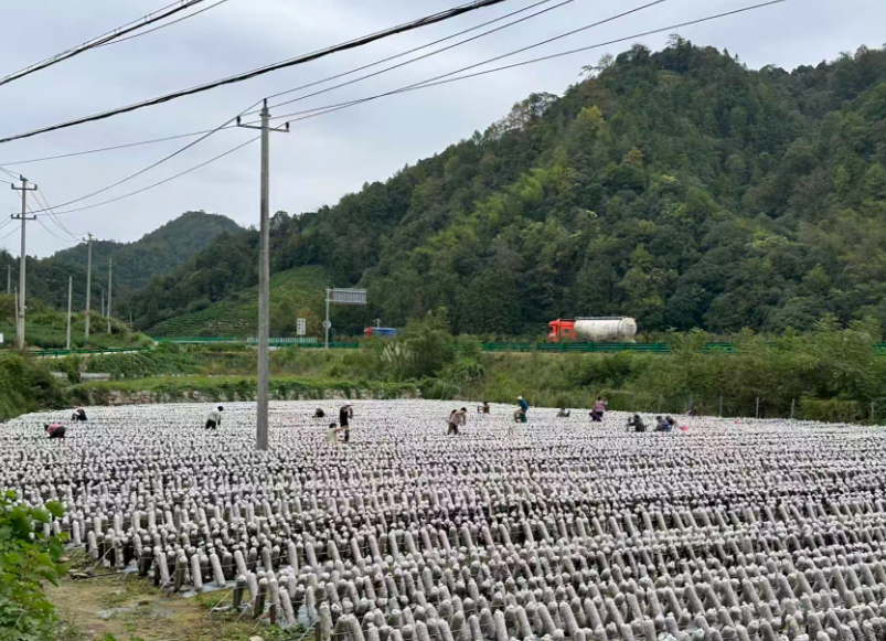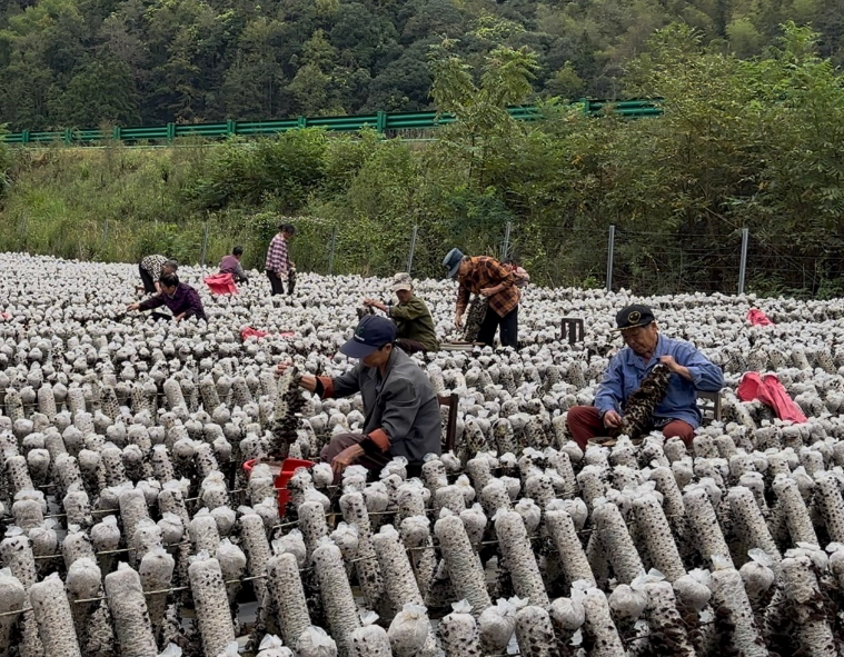 深秋时节,祁门县大坦乡联枫村的高架桥旁,一派热闹景象。村民们正忙着采摘成熟的木耳,一排排菌棒上长满了肥厚黝黑的木耳,如同黑色的花朵绽放。