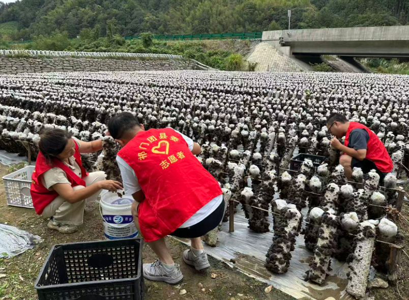 这些菌棒是联枫村今年8月才开始发酵培育的,短短两个月,这些“黑金”已从菌棒中悄然冒出,迎来了首个收获季节。村民和志愿者们熟练而迅速地采摘着成熟的木耳,并第一时间进行晾晒,一派繁忙的劳动景象。