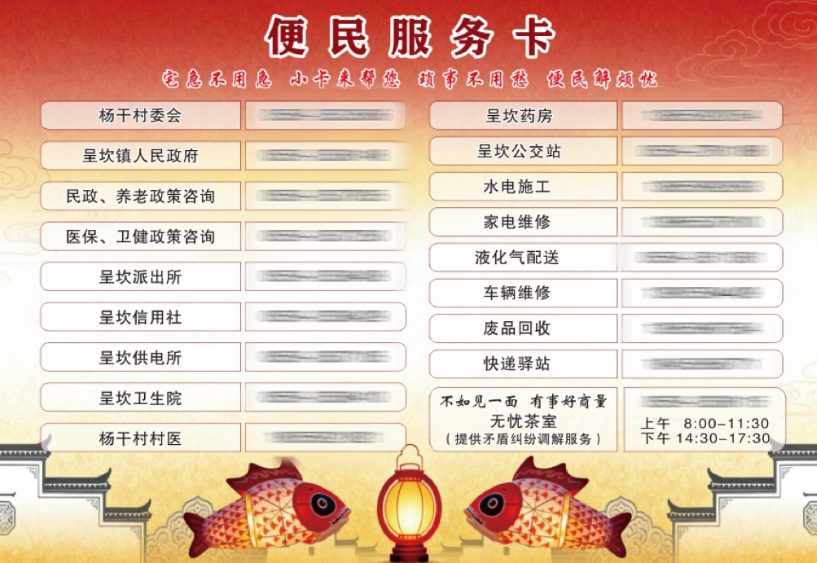 便民服务卡的内容堪称“全能”:既有各村村委会、镇政府、民政养老、医保卫健、派出所等政务热线,也涵盖呈坎药房、公交站、供电所、卫生院等公共服务点位电话;水电施工、家电维修、液化气配送、废品回收等生活服务商户联系方式也一一列明。尤为贴心的是,卡片上特意标注了“无忧茶室”的热线与服务时间,这个以茶文化为载体的调解阵地,专为村民提供矛盾调解、情绪疏导、政策咨询服务,其联系电话醒目地印在卡片上,成为村民化解邻里纠纷、倾诉烦心事的“暖心通道”。